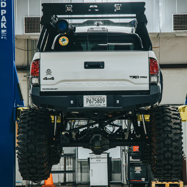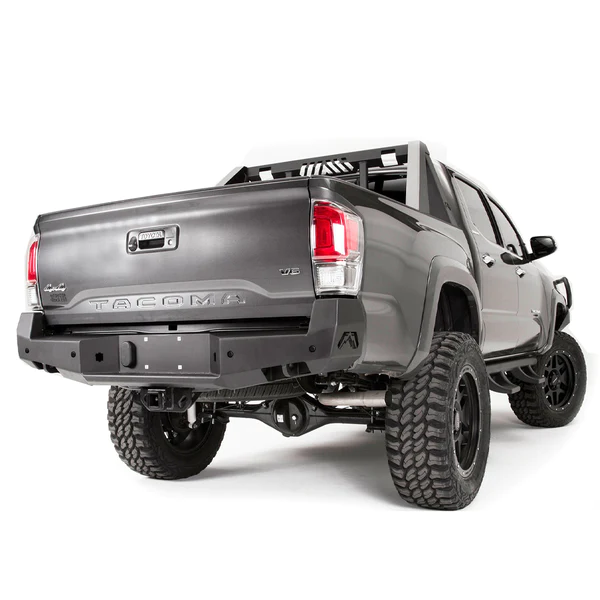 Fab Fours Toyota Tacoma rear replacement bumper integrates the existing receiver hitch. In addition to added style and formed-steel durability, the vehicle gains recovery points. Designed to be the ultimate in functionally-stylish rear-end protection.